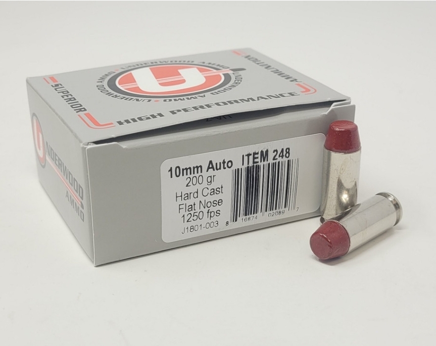 This 10mm cartridge by Underwood features a 200 grain hard cast projectile. The solid bullet is great for protection from the bear variety of threat, because unlike a hollow point it puts 100 percent of its focus into deep penetration. This bullet’s flat nose profile will pierce tough hide with ease, and keep its orientation correct for a deep wound cavity. (Hogs aren’t fond of this type of bullet, either.)