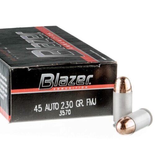 CCI Blazer ammo is a widely used training load thanks to its low cost and reliability. This .45 ACP ammunition fires a heavy 230 grain full metal jacket bullet at a muzzle velocity of 845 feet per second. It’s perfect for 1911s and other .45 Auto pistols.
