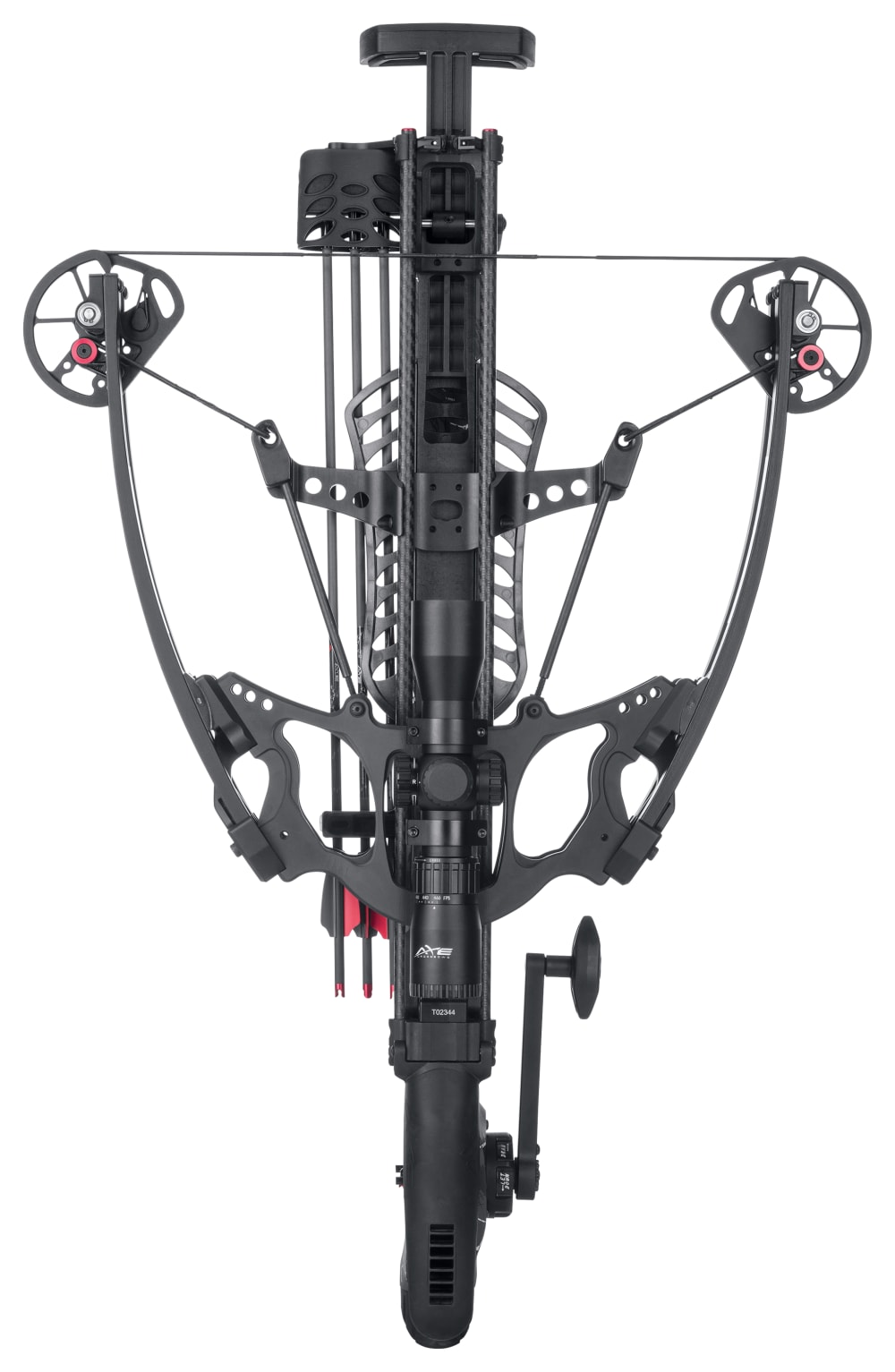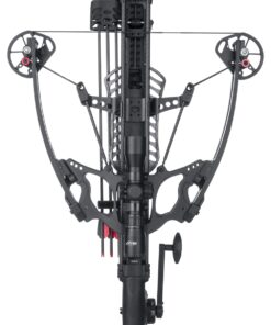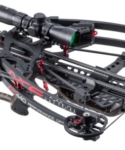 Enjoy easy-handling balance and incredible speed from the Axe Crossbows AX400 Crossbow Package. Thanks to a shoot-through riser and balanced center of mass, this compact crossbow is easy to maneuver, while the reverse-limb design propels bolts downrange at a blistering 440 fps, despite just a 15″ power stroke. Just 30.5″L and only 11.5″ axle to axle when cocked, the AX440 is perfect for hunting from a blind or treestand. The proprietary cam system boasts 85% efficiency and centers the string along the same plane throughout the entire power stroke to maximize speed and accuracy. The AX440 eliminates the standard crossbow rail, instead guiding the bolt down dual carbon rods, plus it pairs with the tunable roller rest to minimize speed-robbing friction and accuracy-destroying torque. All these features mean the AX440 can take advantage of a small-diameter bolt system, shooting 19.5″, .166″ I.D. bolts with precision. Plus the bolts have an aluminum capture-nock system that makes an audible click when fully engaged with the string so there are no nocking mistakes. The 3.5-lb. trigger with zero creep enhances accuracy, plus it resets to the safe position after every shot, making this one of the safest crossbows available. The integrated crank with cock and de-cock features pair with an adjustable, collapsible foot hold to make drawing a breeze. An adjustable butt stock and cheek comb provide ample customization for the perfect fit. The Axe Crossbows AX440 Crossbow Package includes: crossbow, integrally-mounted 3-arrow quiver, multi-range illuminated 440 reticle scope, 3 AXE micro bolts, and 3 100-gr. field points. Speed: 440 fps. Length: 30.5″. Width: 11.5″ (cocked), 16.6″ (uncocked). Power Stroke: 15″. Weight: 10.5 lbs. (without scope).